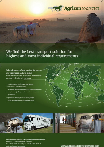 Agricon-Logistics GmbH & Co. KG | International Horse TransportsBargloy 17 | 27793 Wildeshausen (Germany)Fon: +49 (0) 44 31 - 73 84 -80 | Fax: +49 (0) 44 31 - 73 84 -81Mail: info@agricon-logistic.com www.agricon-horsetransports.comTake advantage of our passion for horses,our experience and our highlyqualified team and a reliable, world-widenetwork of selected partners.p road transport in Germany and Europep import and export clearancep pre export quarantine in our own quarantine stablesp completion of all export documents and customs formalitiesp global horse transportation by airfreightp flight attendance by professional groomsWe find the best transport solution forhighest and most individual requirements!Agricon-Logistics GmbH & Co. KG | International Horse TransportsBargloy 17 | 27793 Wildeshausen (Germany)Fon: +49 (0) 44 31 - 73 84 -80 | Fax: +49 (0) 44 31 - 73 84 -81Mail: info@agricon-logistic.com www.agricon-horsetransports.comTake advantage of our passion for horses,our experience and our highlyqualified team and a reliable, world-widenetwork of selected partners.p road transport in Germany and Europep import and export clearancep pre export quarantine in our own quarantine stablesp completion of all export documents and customs formalitiesp global horse transportation by airfreightp flight attendance by professional groomsWe find the best transport solution forhighest and most individual requirements!