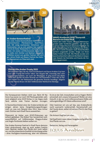 EQUUS Arabian %u01c0 05.2025EQUUS Arabian %u01c0 05.2025 5 InhaltWAHO-Konferenz 2025: Touren mitBesuch von Dubai StudNeben den vielen Touren, die zum Rahmenprogramm jeder Konferenz geh%u00f6ren, war der Besuch von Dubai Stud ein absolutes Highlight. Esgab einen Katalog mit den Pedigrees der 60 Stuten, die in sechs Gruppen nach Stutenfamiliensortiert vorgestellt wurden. Einige von ihnenhatten Fohlen bei Fu%u00df. Alle Pferde wurden entspannt pr%u00e4sentiert w%u00e4hrend die G%u00e4ste in bequemen Sesseln bei Getr%u00e4nke und Snacks die Vorf%u00fchrung genossen.Neben den vielen Touren, Touren, die zum Rahmenpro Rahmenprogramm jeder Konferenz geh%u00f6ren, war der Besuch von Dubai Stud ein absolutes Highlight. Esgab einen Katalog mit den Pedigrees der 60 StuWAHO-Konferenz 2025: Touren mitBesuch von Dubai StudNeben den vielen Touren, Touren, die zum Rahmenpro Rahmenprogramm jeder Konferenz geh%u00f6ren, war der Besuch von Dubai Stud ein absolutes Highlight. Esgab einen Katalog mit den Pedigrees der 60 Stuten, die in sechs Gruppen Gruppen nach Stutenfamilien Stutenfamiliensuch von Dubai Stud ein absolutes Highlight. Esgab einen Katalog mit den Pedigrees der 60 Stuten, die in sechs Gruppen nach Stutenfamiliensortiert vorgestellt wurden. Einige von ihnenhatten Fohlen bei Fu%u00df. Alle Pferde wurden entspannt pr%u00e4sentiert w%u00e4hrend die G%u00e4ste in bequeDistanzritte Araber-Trophy 2025Mit den Ritten %u00fcber die Alp, Asil Club Marbach und Equus Arabian Cup kamman dem Trophy-Ziel immer n%u00e4her. Der l%u00e4ngste Ritt, erstmalig %u00fcber zehnTage ausgeschrieben, war auch der Wichtigste. Er ging durch das WeiteLand %u00fcber die Alb mit einer Strecke von 702 Kilometern. Unter den 32 Reitern haben nur vier Reiterpaare die gesamte Strecke bew%u00e4ltigt. Siegerinwurde Therese Braun mit dem Vollblutaraber Mahbuk Ibn Bendigo.XV. Araber-SommerfestivalDas erste Araber-Sommerfestival fand 2010 im%u00f6sterreichischen Pferdezentrum Stadl-Paurastatt. Mit stetig wachsenden Teilnehmer- undStarterzahlen hat es sich seitdem fest etabliertund ist ein fester Bestandteil im Jahresterminkalender. Am ersten Juli-Wochenende dieses Jahres trafen sich Z%u00fcchter und Besitzer arabischerVollbl%u00fcter erneut zum gro%u00dfen Festival. Seit einigen Jahren findet auf diesem Festival das National Championat Championat von %u00d6sterreich %u00d6sterreich statt.Distanzritte Araber-Trophy 2025Mit den Ritten %u00fcber die Alp, Asil Club Marbach und Equus Arabian Cup kamman dem Trophy-Ziel immer n%u00e4her. Der l%u00e4ngste Ritt, erstmalig %u00fcber zehnTage ausgeschrieben, war auch der Wichtigste. Er ging durch das WeiteLand %u00fcber die Alb mit einer Strecke von 702 Kilometern. Unter den 32 ReiDistanzritte Araber-Trophy 2025Mit den Ritten %u00fcber die Alp, Asil Club Marbach und Equus Arabian Cup kamman dem Trophy-Ziel immer n%u00e4her. Der l%u00e4ngste Ritt, erstmalig %u00fcber zehnTage ausgeschrieben, war auch der Wichtigste. Er ging durch das WeiteLand %u00fcber die Alb mit einer Strecke von 702 Kilometern. Unter den 32 Reitern haben nur vier Reiterpaare Reiterpaare die gesamte gesamte Strecke Strecke bew%u00e4ltigt. bew%u00e4ltigt. Siegerin Siegerinwurde Therese Therese Braun mit dem Vollblutaraber Vollblutaraber Mahbuk Ibn Bendigo. Bendigo.Neben den vielen Touren, die zum Rahmenprogramm jeder Konferenz geh%u00f6ren, war der Besuch von Dubai Stud ein absolutes Highlight. EsWAHO-Konferenz 2025: Touren mitBesuch von Dubai StudNeben den vielen Touren, Touren, die zum Rahmenpro RahmenproWAHO-Konferenz 2025: Touren mitBesuch von Dubai StudNeben den vielen Touren, die zum Rahmenprogramm jeder Konferenz geh%u00f6ren, war der BeWAHO-Konferenz 2025: Touren mit5830 40Die Konsequenzen bleiben nicht aus. Beim All Nations Cup waren nur noch 130 Pferde gemeldet, w%u00e4hrend zeitgleich eine GCAT-Schau in Las Vegas stattfand, welche viele Trainer Aachen vorzogen.In Deutschland bietet einer der Araberverb%u00e4nde seiteinigen Jahren keine Hengstleistungspr%u00fcfungenmehr an, was zum Beispiel dazu f%u00fchrt, dass immermehr Z%u00fcchter nach Stadl Paura ausweichen.%u00d6sterreich ist bisher vom GCAT-Ph%u00e4nomen verschont geblieben. Die Global Tour konzentriert sichausschlie%u00dflich auf Vollblutaraber, Shagya-Araberund Anglo-Partbreds bleiben au%u00dfen vor.Das Araber-Sommer-Festival in Stadl Paura demonstriert eindrucksvoll, dass es auch anders funktioniert: Besitzer stellen ihre Pferde dort noch selbstvor, und die pr%u00e4sentierte Qualit%u00e4t ist durchweg solide%u2013 ohne Hochglanz-Inszenierung, aber mit Substanz.Es ist an der Zeit, innezuhalten und zu fragen: Wohinentwickelt sich unsere Schauszene? Wollen wir eineZukunft, in der nur noch millionenschwere St%u00e4lle undzahlungskr%u00e4ftige VIP-G%u00e4ste willkommen sind?Oder besinnen wir uns auf das, was Araberpferdezucht ausmacht: Leidenschaft, Gemeinschaft unddie Freude daran, selbst mit seinem Pferd in den Ringzu gehen?Die Antwort liegt bei uns allen.Viel Spa%u00df beim Lesen dieser Ausgabe und gr%u00fc%u00dfen Sieihre Pferde von uns.Redaktion, Verlag und Herausgeber