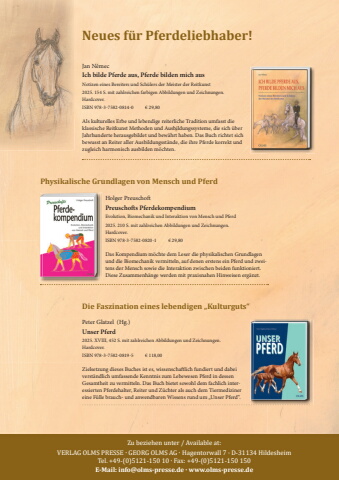 1Neues f%u00fcr Pferdeliebhaber!Zu beziehen unter / Available at:VERLAG OLMS PRESSE %u00b7 GEORG OLMS AG %u00b7 Hagentorwall 7 %u00b7 D-31134 HildesheimTel. +49-(0)5121-150 10 %u00b7 Fax: +49-(0)5121-150 150E-Mail: info@olms-presse.de %u00b7 www.olms-presse.deJan N%u011bmecIch bilde Pferde aus, Pferde bilden mich ausNotizen eines Bereiters und Sch%u00fclers der Meister der Reitkunst2025. 154 S. mit zahlreichen farbigen Abbildungen und Zeichnungen.Hardcover.ISBN 978-3-7582-0814-0 %u20ac 29,80Als kulturelles Erbe und lebendige reiterliche Tradition umfasst dieklassische Reitkunst Methoden und Ausbildungssysteme, die sich %u00fcberJahrhunderte herausgebildet und bew%u00e4hrt haben. Das Buch richtet sichbewusst an Reiter aller Ausbildungsst%u00e4nde, die ihre Pferde korrekt undzugleich harmonisch ausbilden m%u00f6chten.Holger PreuschoftPreuschofts PferdekompendiumEvolution, Biomechanik und Interaktion von Mensch und Pferd2025. 210 S. mit zahlreichen Abbildungen und Zeichnungen.Hardcover.ISBN 978-3-7582-0820-1 %u20ac 29,80Das Kompendium m%u00f6chte dem Leser die physikalischen Grundlagenund die Biomechanik vermitteln, auf denen erstens ein Pferd und zweitens der Mensch sowie die Interaktion zwischen beiden funktioniert.Diese Zusammenh%u00e4nge werden mit praxisnahen Hinweisen erg%u00e4nzt.Peter Glatzel (Hg.)Unser Pferd2025. XVIII, 452 S. mit zahlreichen Abbildungen und Zeichnungen.Hardcover.ISBN 978-3-7582-0819-5 %u20ac 118,00Zielsetzung dieses Buches ist es, wissenschaftlich fundiert und dabeiverst%u00e4ndlich umfassende Kenntnis zum Lebewesen Pferd in dessenGesamtheit zu vermitteln. Das Buch bietet sowohl dem fachlich interessierten Pferdehalter, Reiter und Z%u00fcchter als auch dem Tiermedizinereine F%u00fclle brauch- und anwendbaren Wissens rund um %u201eUnser Pferd%u201c.Physikalische Grundlagen von Mensch und PferdDie Faszination eines lebendigen %u201eKulturguts%u201c