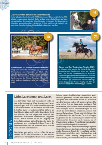4 EQUUS Arabian %u01c0 06.2025 InhaltSieger und Top Ten Araber-Trophy 2025In diesem Jahr waren die Distanzritte vollerSpannung und fanden von M%u00e4rz bis Oktoberstatt. Um in die Jahreswertung zu kommen,z%u00e4hlen die gelaufenen Kilometer eines Pferdes.Es k%u00f6nnen mehr als eintausend Kilometer geritten werden. Die Schweizerin Veronika M%u00fcngerist die Siegerin der Araber-Trophy mit 1084 gelaufenen Kilometern ihres Shagya-Arabers.Liebe Leserinnen und Leser,das Jahr 2023 neigt sich traurig dem Ende. Eswar voller Aufregung. Viele Kunden und derenAngeh%u00f6rigen sind durch die Auswirkungen derCorona-Pandemie, die bis heute sp%u00fcrbar sind,betroffen zum Teil arbeitsunf%u00e4hig, schwer erkrankt oder leben nicht mehr. So wird der Kreisder Macher, die uns zeigen wie man mit dersensiblen arabischen Pferderasse umgehenmuss, immer kleiner. Sei es im Umgang undbeim Reiten dieser edlen Pferde oder beim Organisieren von prestigetr%u00e4chtigen Events. Soschmerzlich es alles ist, es %u00f6ffnet neue Tore f%u00fcrdie n%u00e4chsten Generationen.Das Leben geht weiter und so hoffen die Veranstalter, die f%u00fcr die Schausaison in den letztenJahren neue Konzepte f%u00fcr ihre Events erarbeitethaben, neben den bisherigen Ausstellern auchneue zu gewinnen, um den Besuchern die Vielseitigkeit der arabischen Pferde zu pr%u00e4sentieren. Die Termine stehen oft schon mehrere Monate vorher fest, so dass Jeder gen%u00fcgend Zeitfinden kann, seine Pferde hierauf vorzubereiten.Das Gelingen dieser Veranstaltungen ist nurdurch die Aktivit%u00e4t der einzelnen Z%u00fcchter, Halter und Reiter dieser Pferde m%u00f6glich. Zeigen Sieihre Pferde in der Vielfalt der Zuchtrichtungen,begeistern Sie die Zuschauer, und lassen Sie dieinteressierten Besucher auch wissen, wo inDeutschland und den Anrainl%u00e4ndern die bestenarabischen Pferde gehalten werden!Hierzu tr%u00e4gt auch unser Araber-Hengstregisterf%u00fcr die kommende Decksaison bei, das seit 2012gro%u00dfe Resonanz findet. In 14. Auflage werden60 Hengste und %u00fcber zehn Nachzuchten pr%u00e4sentiert. Rund drei%u00dfig Hengsthalter aus EditorialDeutschland, den Niederlanden und TschechiJahresstreffen der asilen Araber FreundeAnfang September trafen sich 40 Mitglieder und G%u00e4ste zur j%u00e4hrlichen Mitgliederversammlung des Asil Clubs und zu einem Gala-Abend auf demromantischen Schlosshotel M%u00fcnchhausen in Aerzen. Ein besonderesHighlight waren die asilen Pferde von Philipp und Patrick Rudolph, dievon deren Familien in ihrer Vielseitigkeit pr%u00e4sentiert wurden.Reitklassen 15. Araber-Sommer-FestivalInsgesamt waren 60 Teilnehmer aus %u00d6sterreich,Deutschland und Slowenien am Start. Allesstand im Zeichen der Pleasure Klassen jeweils inNovice, Advanced und Master. Zum Abschlussfand erstmals die Klasse %u201eFreestyle Ranch Riding%u201c statt, wo kost%u00fcmiert wird bei freier Musikwahl.1610 74EQUUS Arabian %u01c0 06.2025