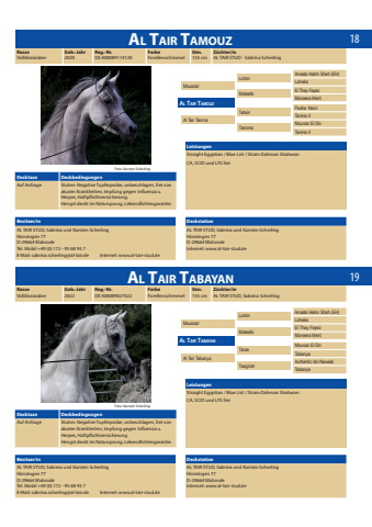 1819LeistungenStraight Egyptian / Blue List / Strain Dahman ShahwanCA, SCID und LFS freiRasseVollblutaraberGeb.-Jahr2020Reg.-Nr.DE 408089114120Farbe ForellenschimmelStm. 155 cmZ%u00fcchter/inAL TAIR STUD - Sabrina ScherlingBesitzer/in DeckstationAL TAIR STUD, Sabrina und Karsten ScherlingH%u00fcnzingen 77D-29664 WalsrodeTel. Mobil +49 (0) 172 - 95 68 95 7E-Mail: sabrina.scherling@al-tair.de Internet: www.al-tair-stud.deAL TAIR STUD, Sabrina und Karsten ScherlingH%u00fcnzingen 77D-29664 WalsrodeInternet: www.al-tair-stud.deAl Tair TamouzFoto: Karsten ScherlingDecktaxe DeckbedingungenAuf Anfrage Stuten: Negative Tupferprobe, unbeschlagen, frei von akuten Krankheiten, Impfung gegen Influenza u. Herpes, Haftpflichtversicherung.Hengst deckt im Natursprung. Lebendfohlengarantie.LohimMateefaTahsinTakrima Ansata Halim Shah (EH)LoheliaEl Thay FayezMoneera Merit Pasha YasinTamria IIMounaz El DinTamria IIMouazarAl Tair TamriaAl Tair TamouzLeistungenStraight Egyptian / Blue List / Strain Dahman ShahwanCA, SCID und LFS freiRasseVollblutaraberGeb.-Jahr2022Reg.-Nr.DE 408089027022Farbe ForellenschimmelStm. 155 cmZ%u00fcchter/inAL TAIR STUD, Sabrina ScherlingBesitzer/in DeckstationAL TAIR STUD, Sabrina und Karsten ScherlingH%u00fcnzingen 77D-29664 WalsrodeTel. Mobil +49 (0) 172 - 95 68 95 7E-Mail: sabrina.scherling@al-tair.de Internet: www.al-tair-stud.deAL TAIR STUD, Sabrina und Karsten ScherlingH%u00fcnzingen 77D-29664 WalsrodeInternet: www.al-tair-stud.deAl Tair TabayanLohimMateefaTarasTaagirahAnsata Halim Shah (EH)LoheliaEl Thay FayezMoneera MeritMounaz El DinTabanyaAuthentic Ibn NawaalTabanyaMouazarAl Tair TabanyaAl Tair TabayanFoto: Karsten ScherlingDecktaxe DeckbedingungenAuf Anfrage Stuten: Negative Tupferprobe, unbeschlagen, frei von akuten Krankheiten, Impfung gegen Influenza u. Herpes, Haftpflichtversicherung.Hengst deckt im Natursprung. Lebendfohlengarantie.