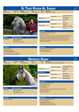 LeistungenMoushah ist ein typvoller Hengst der 9 VZAP-Elitepferde im Pedigree vereint. Sein harmonischer K%u00f6rperbau mit ausgepr%u00e4gten Reitpferdepoints, eine auffallend gute Galoppade u. sein ausgesprochen freundliches Wesen machen ihn zu etwas besonderem. 2020 wurde er mit 7,5 Pkt. u. goldener Schleife beim ZSAA eingetragen. 2021 erwies er sich %u00fcber mehrere hundert Kilometer als zuverl%u00e4ssiger Partner im Distanzsport. 2023 legte er seine HLP in Stadl-Paura ab u. war m.d. Gesamtpunktzahl 8,53 %u00fcberragende Sieger (h%u00f6chste Punktzahl, die ein Hengst arab. Abst. je erreicht hat). 2024 folgte die K%u00f6rung beim ZSAA sowie erfolgreiche Vorstellungen auf Dressur- u. Springtunieren Klasse A.Besitzer/in DeckstationGisela HillebrandIn den Sieben %u00c4ckern 7D-31162 Bad Salzdetfurth Tel. Mobil +49 (0) 157 - 54 97 92 44E-Mail: Giselahillebrand@t-online.deGiseh Arabians, Gisela HillebrandIn den Sieben %u00c4ckern 7D-31162 Bad SalzdetfurthRasseVollblutaraberGeb.-Jahr2014Reg.-Nr.DE 408089000214Farbe ForellenschimmelStm. 151 cmZ%u00fcchter/in ZG Tauschke und BesteEl Thay Kayan Al SabahAnsata HejaziTabanyaAnsata SelmanKamla IIAnsata Halim Shah (EH)Ansata SudarraHamasa NabihTamria IIAnsata HejaziG ShafariaAnsata Halim Shah (EH)Mona IIIAjmal TameenEl Thay KamriaEl Thay Kayan Al SabahDecktaxe Deckbedingungen1.200 %u20ac Negative Tupferprobe, hinten unbeschlagenLeistungenStraight Egyptian - Dahman ShahwanCA, SCID und LFS freiEingeritten nach den Prinzipien des Natural Horsemanships, Left Brain Extro,ehrlich und gut erzogen. In seinen Fohlen finden wir seinen ehrlichen, lebensfrohen und coolen Charakter. Auch die gro%u00dfen Augen und seinen wundersch%u00f6nen Typ gibt Kayan an seine Nachzucht weiter. Bislang %u00fcberwiegend Stutfohlen.Foto: Carola ToischelDecktaxe DeckbedingungenAuf Anfrage aktuelle Tupferprobehinten keine Eisen Natursprung an der HandRasseVollblutaraberGeb.-Jahr2017Reg.-Nr.DE 408089073217Farbe SchimmelStm. 151 cmZ%u00fcchter/in Gisela Hillebrand, D-31162 Bad SalzdetfurthNafayez GisehEl Thay Ibn Halim Shah28 FaragMessaoud (EH)Hamasa ItidalAnsata Halim Shah (EH)Mahameh (ES)Farag (EH)TamriaMadkour (EH)Maymoonah (ES)Hamasa KhazzanHamasa IndshimaEl Thay FayezCM Naafeedah El ErbNafayez GisehLeistungenMoushah ist ein typvoller Hengst der 9 VZAP-Elitepferde im Pedigree vereint. Sein harmonischer K%u00f6rperbau mit ausgepr%u00e4gten Reitpferdepoints, eine auffallend gute Galoppade u. sein ausgesprochen freundliches Wesen machen ihn zu etwas besonderem. 2020 wurde er mit 7,5 Pkt. u. goldener Schleife beim ZSAA eingetragen. 2021 erwies er sich %u00fcber mehrere hundert Kilometer als zuverl%u00e4ssiger Partner im Distanzsport. 2023 legte er seine HLP in Stadl-Paura ab u. war m.d. Gesamtpunktzahl 8,53 %u00fcberragende Sieger (h%u00f6chste Punktzahl, die ein Hengst arab. Abst. je erreicht hat). 2024 folgte die K%u00f6rung beim ZSAA sowie erfolgreiche Vorstellungen auf Dressur- u. Springtunieren Klasse A.Besitzer/in DeckstationJasmin Stuhlemmer Giseh Arabians, Gisela HillebrandIn den Sieben %u00c4ckern 7D-31162 Bad SalzdetfurthTel. Mobil +49 (0) 157 - 54 97 92 44E-Mail: Giselahillebrand@t-online.deDecktaxe Deckbedingungen1.200 %u20ac Negative Tupferprobe, hinten unbeschlagenFoto: Anke JuwrackLeistungenStraight Egyptian, Asil, Blue ListDamline: Om Dalal dbSireline: Saklawi 1 dbCA und SCID freiEingeritten nach den Prinzipien des Natural HorsemanshipIm Morafic Typ stehendBislang 2 StutfohlenDecktaxe DeckbedingungenAuf Anfrage aktuelle Tupferprobehinten keine Eisen Natursprung an der Hand2223