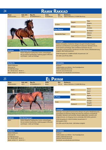 Ramik RakkadLeistungenSolider, kompakter, maskuliner Hengst mit guter Schulter, Kruppe, Widerrist und Oberlinie sowie kr%u00e4ftigem Fundament, R%u00f6hrbein 20 cm.Guter Schritt und Galopp, Takt und Balance zeichnen ihn aus. Freundlich und kooperativ, Gentleman mit allen Stuten, Weidebedeckung m%u00f6glich. Alle Fohlen pr%u00e4miert.ZSAA Hengstbuch I, SILBER-Schleife, Gesamtnote 7,34 CA, SCID und LFS frei, EEAARasseVollblutaraberGeb.-Jahr2012Reg.-Nr.DE 408089026412Farbe DunkelbraunStm. 151 cmZ%u00fcchter/in Sabine Hallmann, D-32683 BarntrupBesitzer/in DeckstationSabine HallmannOstersiek 34 D-32683 BarntrupTel. +49 (0) 52 62 - 99 59 11 Mobil +49 (0) 171 - 80 47 61 1El DimorVollblutaraber zum Reiten - Ihre FreizeitpartnerE-Mail: araber@el-dimor.deInternet: www.el-dimor.deFacebook: www.facebook.com/el.dimorDecktaxe Deckbedingungen550 %u20ac Stuten: Negative Tupferprobe, hinten unbeschlagen, frei von akuten Krankheiten, Impfung gegen Influenzaund Herpes - mehr auf Anfrage.DiagramEl DinariRahawiRawaPalasDraperiaEubenContessaIbn Shaker IRafawna CeratzoRafawnaEl DimorRamirah Bint RawaRamik RakkadEl PayamLeistungenRahmiger und zugleich harmonischer Hengst mit guten Reitpferdepointsund starkem Fundament, G%u00e4nge mit Schwung, elastisch und kraftvoll. Charakter: Gelassen und souver%u00e4n, Neuem gegen%u00fcber souver%u00e4n und aufgeschlossen, im Umgang immer anst%u00e4ndig. Alle Fohlen pr%u00e4miert.ZSAA Hengstbuch I, GOLD-Schleife, Gesamtnote 7,72022 gek%u00f6rt ZSAACA, SCID und LFS frei, EeAa - alle Farben m%u00f6glichRasseVollblutaraberGeb.-Jahr2015Reg.-Nr.DE 408089022515Farbe BraunStm. 159 cmZ%u00fcchter/inSabine Hallmann, D-32683 BarntrupBesitzer/in DeckstationSabine HallmannOstersiek 34 D-32683 BarntrupTel. +49 (0) 52 62 - 99 59 11 Mobil +49 (0) 171 - 80 47 61 1El Dimor Vollblutaraber zum Reiten - Ihre FreizeitpartnerE-Mail: araber@el-dimor.deInternet: www.el-dimor.deFacebook: www.facebook.com/el.dimorDecktaxe Deckbedingungen650 %u20ac Stuten: Negative Tupferprobe, hinten unbeschlagen, frei von akuten Krankheiten, Impfung gegen Influenzaund Herpes - mehr auf Anfrage.Nadir IKuponaEl DimorPrichina 31NemanNeschiKupolRigonaDiagramEl Dinari NougatinPritcha 8Kunar TPrishaEl Payam2425