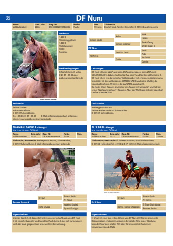 LeistungenDF Nuri ist beim VZAP eingetragen. Beim ZSAA erhielt er die GOLDSCHLEIFE, (u.a. Typ 9 und Korrektheit 8). DF Nuri ist ein rein %u00e4gyptischer Vollblutaraber mit erlesener Abstammung. Sein Vater ist der weltbekannte SIMEON SADIK und seine Mutter die traumhaft sch%u00f6ne AR Ninive, die auf JAMIL zur%u00fcckgeht. Da Nuris Eltern Rappen sind, ist er ein %u201eRappe im Fuchspelz%u201c und hat bei seiner Nachzucht schon etliche Rappen. Aber das Wichtigste ist sein traumhaft sanfter CHARAKTER! Nuri hat mittlerweile %u00fcber 40 Nachkommen, die als Reit- und/oder Zuchtpferde eingesetzt werden. Sein Sohn EL S Sari gewann dieses Jahr mehrere MDR (mittlere Distanzritte).Besitzer/in DeckstationSabine K%u00f6rber Industriestra%u00dfe 19D-53949 SchmidtheimTel. +49 (0) 24 47 - 84 48 E-Mail: info@arabergestuet-antaris.deInternet: www.arabergestuet-antaris.deArabergest%u00fct AntarisSabine K%u00f6rber und Kurt SchumacherD-53949 SchmidtheimDecktaxe1.200 %u20ac VA rein %u00e4gyptisch1.000 %u20acVollblutaraber500 %u20ac SonstigeDeckbedingungenInfos telefonisch unter +49 (0) 24 47 - 84 48 oderarabergestuet-antaris.deRasseVollblutaraberGeb.-Jahr2006Reg.-Nr.DE 408082093906006Farbe FuchsStm. 155 cmZ%u00fcchter/in Familie Dirnhofer, D-93133 BurglengenfeldFoto: Joanna JonientzDF NuriAsfourSimeon SafanadJasir Ibn JamilGalilaMalik (EH)Hanan (ES)Sankt Georg27 Ibn Galal - 5Jamil (EH)AidaIbn Galal (EH)GamilaSimeon SadikAR NiniveDF NuriLeistungenDF Nuri ist beim VZAP und beim ZSAA eingetragen, beim ZSAA mit GOLDSCHLEIFE, dabei erhielt er f%u00fcr Typ eine 9 und f%u00fcr Korrektheit eine 8. DF Nuri ist ein rein %u00e4gyptischer Vollblutaraber mit erlesener Abstammung. Sein Vater ist der weltbekannte SIMEON SADIK und seine Mutter, die traumhaft sch%u00f6ne AR Ninive, die auf JAMIL zur%u00fcckgeht. Da Nuris Eltern Rappen sind, ist er ein %u201eRappe im Fuchspelz%u201c und hat bei seiner Nachzucht schon 11 Rappen. Aber das Wichtigste ist sein traumhaft sanfter CHARAKTER !Besitzer/in DeckstationSabine K%u00f6rber Industriestra%u00dfe 19D-53949 SchmidtheimTel. +49 (0) 24 47 - 84 48 E-Mail: info@arabergestuet-antaris.deInternet: www.arabergestuet-antaris.deArabergest%u00fct AntarisSabine K%u00f6rber und Kurt SchumacherD-53949 SchmidtheimDecktaxe1.200 %u20ac VA rein %u00e4gyptisch1.000 %u20acVollblutaraber500 %u20ac SonstigeDeckbedingungenInfos telefonisch unter 0 24 47 - 84 48 oderarabergestuet-antaris.deRasseVollblutaraberGeb.-Jahr2006Reg.-Nr.DE 408082093906006Farbe FuchsStm. 155 cmZ%u00fcchter/in Birkhof Stud, Familie Dirnhofer, D-93133 BurglengenfeldFoto: Joanna JonientzDF NuriAsfourSimeon SafanadJasir Ibn JamilGalilaMalikHananSankt Georg27 Ibn Galal - 5JamilAidaIbn GalalCamilaSimeon SadikAR NiniveDF NuriShaman Sadik A - HengstNachzucht von DF NuriRasseVollblutaraberGeb.-Jahr2018Reg.-Nr.DE 408089009518FarbeFuchsStm. Z%u00fcchter/in / Besitzer/in: Arabergest%u00fct Antaris, Sabine K%u00f6rber, D-53949 Schmidtheim, E-Mail: info@arabergestuet-antaris.deDF NuriInsha ShualaShaman Sadik ASimeon SadikAR NiniveNayiel Al KhaledPyramid SadiyyaEigenschaften EigenschaftenShaman Sadik A ist das erste Fohlen unserer Insha Shuala von DF Nuri. Er ist ein sehr typvoller und korrekter Fuchshengst, der sich zu bewegen wei%u00df. Wir sind gespannt auf seine weitere Entwicklung.El S Sari ist einer der ersten S%u00f6hne von DF Nuri. 2019 ist er seine erste Distanzsaison erfolgreich gelaufen. Er hat alle Ritte in der Wertung beendet! Auf dem letzten Ritt %u00fcber 52 km erreichte Sari einen hervorragenden 2. Platz.El S Sari - HengstNachzucht von DF NuriRasseVollblutaraberGeb.-Jahr2013Reg.-Nr.DE 408089089711FarbeFuchsStm. 154 cmZ%u00fcchter/in / Besitzer/in: El Sadeek Arabians, Ruth Wollenschein, D-53940 Hellenthal, Tel. +49 (0) 24 47 - 82 35, E-Mail: elsadeek@web.deDF NuriDahmr. Samra GhazalahhEl S Sari Simeon SadikAR NiniveEl Thay Shah ManialRamses SanthaFoto: Joanna Jonientz35