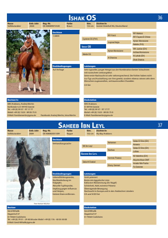 LeistungenGold pr%u00e4miertBeste rein %u00e4gyptische LinieExklusive Abstammung (Dr. Nagel)Sch%u00f6nheit, Adel, extreme Pr%u00e4senz%u00dcberragende BewegungNachzucht in Europa und in den Arabischen L%u00e4ndernCA und SCID freiBesitzer DeckstationGerd MihalikHagenhof 37D-74564 CrailsheimTel. +49 (0) 79 51 - 29 40 84 oder Mobil +49 (0) 176 - 40 05 50 00 E-Mail: Gerd-Mihalik@gmx.deGerd MihalikHagenhof 37D-74564 CrailsheimDecktaxeVerhandlungssacheDeckbedingungenLebendfohlengarantie,Nachbedeckung im Folgejahr,Aktuelle Tupferprobe, Impfung gegen Influenza und Herpes,hintere Eisen entfernen.RasseVollblutaraberGeb.-Jahr2009Reg.-Nr.DE 408082051309Farbe RappeStm. 152 cmZ%u00fcchter/in Aly Bay ArabiansFoto: Norbert W%u00fcscherSaheeb Ibn LeylNahamanNashwaHamras PicassoEbony SennariSalaa El Dine (EH)AmeeraSalaa El Dine (EH)LotfeiaAli Valentino (EH)Akiysha Moon DMFAnsata Nile PashaFa SaraneeNK Ibn LeylSaba Al DzabalSaheeb Ibn LeylLeistungenSehr typvoller, junger Hengst aus der Kombination bester Schaulinien mit russischem Leistungsblut. Seine erste Nachzucht ist sehr vielversprechend. Die Fohlen haben nicht nur Typ und Austrahlung von ihm geerbt, sondern ebenso seinen sehr dem Menschen zugewandten, vertrauensvollen Charakter.CA freiBesitzer/in DeckstationMAI Arabians, Andrej MertinKottheide 4, D-49744 GeesteTel. +49 (0) 59 37 - 97 17 77Mobil +49 (0) 1523 - 89 05 75 0 E-Mail: Familiemertin@gmx.de Facebook: Andrej Mertin, Irina MertinMAI ArabiansD-49744 GeesteTel. +49 (0) 59 37 - 97 17 77Mobil +49 (0) 1523 - 89 05 75 0 E-Mail: Familiemertin@gmx.deRasseVollblutaraberGeb.-Jahr 2020Reg.-Nr.DE 408089072320Farbe BraunStm. 152 cmZ%u00fcchter/in Gest%u00fct Osterhof AG, DeutschlandIshak OSRFI FaridInspired NajlaAjman MoniscioneAl ShaninaRFI MaktubRFI Fayara El ShirazAjman MoniscioneNatalia (PrS)WH Justice (EH)Anthea MoniscioneAl Lahab (EH)Shak ShakiraCyclone OS (PrH)Maida OSIshak OSDecktaxe1.500 %u20acDeckbedingungenAuf Anfrage3637