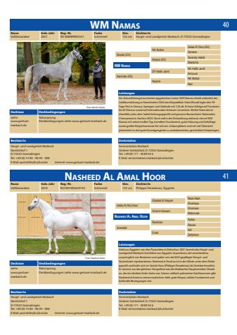 4041LeistungenEin Zukunftshengst aus besten %u00e4gyptischen Linien: WM Namas erhielt anl%u00e4sslich der Jubil%u00e4umsk%u00f6rung in Kranichstein 2024 das K%u00f6rpr%u00e4dikat. Vater Musab legte den 70-Tage-Test in Dressur, Springen und Gel%u00e4nde mit 7,36 ab. Er kann Erfolge auf Turnieren bis M-Dressur sowie auf internationalen Schauen vorweisen. Mutter Namrata ist ebenfalls unter dem Sattel leistungsgepr%u00fcft und gewann Bronze beim Nationalen Championat in Aachen 2023. Noch voll in der Entwicklung stehend, nimmt WM Namas mit seinem edlen Typ, korrekten Fundament, guter Halsung und Sattellage sowie gro%u00dfer K%u00f6rperharmonie f%u00fcr sich ein. Unkompliziert und mit viel %u00dcbersicht pr%u00e4sentiert er drei gute Grundgangarten u. ausbalanciertes, geschicktes Freispringen.RasseVollblutaraberGeb.-Jahr2021Reg.-Nr.DE 408089002521Farbe SchimmelStm.152 cmZ%u00fcchter/in Haupt- und Landgest%u00fct Marbach, D-72532 GomadingenBesitzer/in DeckstationHaupt- und Landgest%u00fct MarbachGest%u00fctshof 1D-72532 Gomadingen Tel. +49 (0) 73 85 - 96 95 - 000E-Mail: poststelle@hul.bwl.de Internet: www.gestuet-marbach.deServicestation MarbachUnterer Gest%u00fctshof, D-72532 Gomadingen Tel. +49 (0) 171 - 30 89 34 6E-Mail: servicestation.marbach@hul.bwl.deDecktaxe Deckbedingungensiehe www.gestuetmarbach.deNatursprungDeckbedingungen siehe www.gestuet-marbach.deWM NamasFoto: Martin KubatNK BolbolMaaza (ES)DF Malik JamilNapirai Salaa El Dine (EH)SananaSerenity HabibMaslamaNK Hafid JamilAmouva NK BolbolNari Musab (EH)Namrata (ES)WM NamasLeistungenAdel aus %u00c4gypten von den Pyramiden in Dahschur: 2021 konnte das Haupt- und Landgest%u00fct Marbach Zuchttiere aus %u00c4gypten importieren, die verschiedene, urspr%u00fcnglich von Beduinen und sp%u00e4ter von der EAO gepflegte Hengst- und Stutenlinien repr%u00e4sentieren. Nasheed al Amal ox ist in der W%u00fcste unter dem Reiter gepr%u00fcft und hatte sich im Gest%u00fct Hoor (Philippe Paraskevas) als Vererber bew%u00e4hrt. Er stammt aus der gleichen Hengstlinie wie der Marbacher Hauptvererber Gharib ox, der ein direkter Anter-Sohn war. Seinen vielfach pr%u00e4mierten Nachkommen gibt Nasheed al Amal ox seinen exotischen Adel, gute K%u00f6rper, solides Fundament und kraftvolle Bewegungen mit.RasseVollblutaraberGeb.-Jahr2010Reg.-Nr.EGY0010E2629192Farbe SchimmelStm.155 cmZ%u00fcchter/in Philippe Paraskevas, %u00c4gyptenBesitzer/in DeckstationHaupt- und Landgest%u00fct MarbachGest%u00fctshof 1D-72532 Gomadingen Tel. +49 (0) 73 85 - 96 95 - 000E-Mail: poststelle@hul.bwl.de Internet: www.gestuet-marbach.deServicestation MarbachUnterer Gest%u00fctshof, D-72532 Gomadingen Tel. +49 (0) 171 - 30 89 34 6E-Mail: servicestation.marbach@hul.bwl.deDecktaxe Deckbedingungensiehe www.gestuetmarbach.deNatursprungDeckbedingungen siehe www.gestuet-marbach.deNasheed Al Amal HoorFoto: Stephan KubeGhallab El AteyahShams KareemRashdan Enad Rezk AllahShameya ShamsanMabrouka Aybac Randa AdlSettohom Hafez Al Ahd HoorAneedah Nasheed Al Amal Hoor
