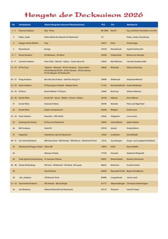 Nr. Deckstation Name Hengst(e) ohne/mit Nachzucht(en) PLZ Ort Besitzer/in1 - 2 Flaxman Arabians Woj - Pinito BE-2960 Brecht Kay und Helen Hennekens-van Nes3 PaKos_Arabs PaKos Wahat ibn Masadi mit Nachzucht CZ PaKos_Arabs, Paula Kovac4 Shagya-Gest%u00fct M%u00fchlen Tayo 24257 K%u00f6hn Andrea Egey5 Neuenbrook Energy 25578 Neuenbrook Ingrid Fr%u00fcchtenicht6 - 7 Alassil Arabians AA Mahzous - AA Nisan 24340 Friedensthal Bettina von Kameke8 - 11 Camelot Arabians Arian Shah - Bahrain - Gabun - Camar Varys AA 23843 Bad Oldesloe Camelot Arabians GbR12 - 19 Al Tair Stud Takreem - Mouazar - Al Tair Tamaiyuz - Tamar Halim - Al Tair Mounaz El Din - Al Tair Tamoun - Al Tair Tamouz - Al Tair Tabayan uff. Nachzucht29664 Walsrode Sabrina Scherling20 - 21 Farag Arabians Mur Mur Ibn El Nasar - Sahil Ibn Farag II-3 30900 Wedemark Stephanie Weirich22 - 23 Giseh Arabians El Thay Kayan Al Sabah - Nafayez Giseh 31162 Bad Salzdetfurth Gisela Hillebrand24 - 25 El Dimor Ramik Rakkad - El Payam 32683 Barntrup Sabine Hallmann26 - 30 Gest%u00fct Rh%u00f6n Ismael AA - Javino - Midras - Acrisius - Bolero 36148 Kalbach Doris Wehner31 Gest%u00fct Rh%u00f6n Hamzah Al Batra 58708 Menden Petra und Nigel Nutt32 Gest%u00fct Rh%u00f6n Aladin mit Nachzucht 58708 Wittgert Heide Losse33 - 34 Faiza Arabians Moushah - DFA Shahir 67826 Hallgarten Livia Jansen35 Arabergest%u00fct Antaris DF Nuri mit Nachzucht 53949 Schmidtheim Sabine K%u00f6rber36 MAI Arabians Ishak OS 49744 Geeste Andrej Mertin37 Hagenhof Saheeb Ibn Leyl mit Nachzucht 74564 Crailsheim Gerd Mihalik38 - 41 HuL Gest%u00fct Marbach WM Daraschad - WM Devdas - WM Namas - Nasheed Al Amal 72532 Gomadingen Haupt- und Landgest%u00fct Marbach42 R%u00fcckenwind Shagya-Araber Athos KM 74834 Elztal Katrin M%u00e4rkle43 Masuan al Diyah 77756 Hausach Stephanie Ringwald44 Frank Sp%u00f6nle Schautraining LF Aarmann Vittorio 84437 Reichertsheim Martina Ostermeier45 - 48 Gest%u00fct Rothenberg GR Fasin - GR Moneef - GR Ishad - GR Layad 86653 Monheim Annette Escher49 Amal Duchan 84494 Neumarkt St. Veit Birgit Schmidbauer50 Jala_Arabians CB Shaamir Amal 85084 Langenbruck Janina Lanzl51 - 52 Goschenhof Arabians PSE Atlanta - Abia El Mujid 91717 Wassertr%u00fcdingen Christoph Gerbershagen53 Gut Windrose Nedschd Sharaf M mit Nachzucht 92714 Pleystein In%u00e9z M. DreyerHengste der Decksaison 2026