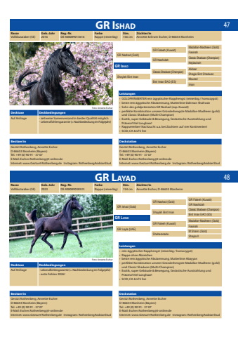 Leistungen%u2022%u0009 rein %u00e4gyptischer Rapphengst (reinerbig / homozygot)%u2022%u0009 Rappe ohne Abzeichen%u2022%u0009 beste rein %u00e4gyptische Abstammung, Mutterlinie Abayyan%u2022%u0009 perfekte Kombination unserer Gr%u00fcnderhengste Madallan-Madheen (gold) und Classic Shadwan (Multi-Champion)%u2022%u0009 Exotik, super Geb%u00e4ude & Bewegung, fantastische Ausstrahlung und Pr%u00e4senz! Viel Langhaar!%u2022%u0009 SCID, CA & LFS freiBesitzer/in DeckstationGest%u00fct Rothenberg, Annette EscherD-86653 Monheim (Bayern)Tel. +49 (0) 90 91 - 37 07E-Mail: Escher.Rothenberg@t-online.deInternet: www.Gestuet-Rothenberg.de Instagram: RothenbergArabianStudGest%u00fct Rothenberg, Annette EscherD-86653 Monheim (Bayern)Tel. +49 (0) 90 91 - 37 07E-Mail: Escher.Rothenberg@t-online.deInternet: www.Gestuet-Rothenberg.de Instagram: RothenbergArabianStudRasseVollblutaraber (SE)Geb.-Jahr2023Reg.-Nr.DE 408089038523Farbe Rappe (reinerbig)Stm. 154 cmZ%u00fcchter/in Annette Escher, D-86653 MonheimGR LayadGR Nashad (Gold)Shaylah Bint ImanGR Faleeh (Kuwait)SheherazadeGR Faleeh (Kuwait)GR NashidahClassic Shadwan (Champion)Bint Iman EAO (ES)Madallan-Madheen (Gold)FasinahM Sharin (Gold)Shayla IIGR Ishad (Gold)GR Layla (UAE)GR LayadDecktaxe DeckbedingungenAuf Anfrage - Lebendfohlengarantie (= Nachbedeckung im Folgejahr)- erste Fohlen 2026!Foto: Annette EscherLeistungen%u2022%u0009 GOLDPR%u00c4MIERTER rein %u00e4gyptischer Rapphengst (reinerbig / homozygot)%u2022%u0009 beste rein %u00e4gyptische Abstammung, Mutterlinie Dahman Shahwan%u2022%u0009 Sohn des goldpr%u00e4mierten GR Nashad (exp. Kuwait)%u2022%u0009 perfekte Kombination unserer Gr%u00fcnderhengste Madallan-Madheen (gold) und Classic Shadwan (Multi-Champion)%u2022%u0009 Exotik, super Geb%u00e4ude & Bewegung, fantastische Ausstrahlung und Pr%u00e4senz! Viel Langhaar!%u2022%u0009 Rappvererber! Nachzucht u.a. bei Z%u00fcchtern auf vier Kontinenten!%u2022%u0009 SCID, CA & LFS freiBesitzer/in DeckstationGest%u00fct Rothenberg, Annette EscherD-86653 Monheim (Bayern)Tel. +49 (0) 90 91 - 37 07E-Mail: Escher.Rothenberg@t-online.deInternet: www.Gestuet-Rothenberg.de Instagram: RothenbergArabianStudGest%u00fct Rothenberg, Annette EscherD-86653 Monheim (Bayern)Tel. +49 (0) 90 91 - 37 07E-Mail: Escher.Rothenberg@t-online.deInternet: www.Gestuet-Rothenberg.de Instagram: RothenbergArabianStudRasseVollblutaraber (SE)Geb.-Jahr2016Reg.-Nr.DE 408089013616Farbe Rappe (reinerbig)Stm. 156 cmZ%u00fcchter/in Annette & Erwin Escher, D-86653 MonheimGR IshadGR Faleeh (Kuwait)GR NashidahClassic Shadwan (Champion)Bint Iman EAO (ES)Madallan-Madheen (Gold)FasinahClassic Shadwan (Champion)NejdschahAlidaarShagia Bint ShadwanMouradImanGR Nashad (Gold)Shaylah Bint ImanGR IshadDecktaxe DeckbedingungenAuf Anfrage - zeitweise Samenversand in bester Qualit%u00e4t m%u00f6glich- Lebendfohlengarantie (= Nachbedeckung im Folgejahr)Foto: Annette Escher4748