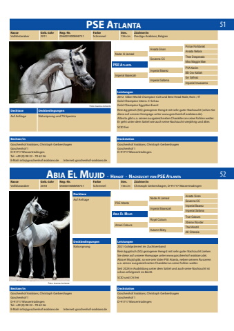 Leistungen2012 Silber World Champion Colt und Best Head Male, Rom / ITGold Champion Intern. C-Schau Gold Champion Egyptian EventRein %u00e4gyptisch (SG) gezogener Hengst mit sehr guter Nachzucht (sehen Sie diese auf unserer Hompage unter www.goschenhof-arabians.de). Atlanta gibt u.a. seinen ausgezeichneten Charakter an seine Fohlen weiter. Er geht unter dem Sattel wie auch seine Nachzucht vierj%u00e4hrig und %u00e4lter.SCID freiBesitzer/in DeckstationGoschenhof Arabians, Christoph GerbershagenGoschenhof 1D-91717 Wassertr%u00fcdingenTel. +49 (0) 98 32 - 70 62 56E-Mail: info@goschenhof-arabians.de Internet: goschenhof-arabians.deGoschenhof Arabians, Christoph GerbershagenGoschenhof 1D-91717 Wassertr%u00fcdingenRasseVollblutaraberGeb.-Jahr2011Reg.-Nr.056001000BA8731Farbe SchimmelStm. 156 cmZ%u00fcchter/in Prestige Arabians, BelgienPSE AtlantaAnsata SinanSavanna CCImperial BaarezImperial SafamaPrince Fa MonietAnsata NefaraThee DesperadoMiss Maggie MaePVA KariimBB Ora KalilahIbn SafinazImperial ImwasamaNader Al JamaalImperial BaarezahPSE AtlantaDecktaxe DeckbedingungenAuf Anfrage Natursprung und TG SpermaFoto: Joanna JonientzLeistungen2021 Goldpr%u00e4miert im ZuchtverbandRein %u00e4gyptisch (SG) gezogener Hengst mit sehr guter Nachzucht (sehen Sie diese auf unserer Hompage unter www.goschenhof-arabians.de). Abia el Mujid gibt, so wie sein Vater PSE Atanta, neben seinem %u00c4usseren u.a. seinen ausgezeichneten Charakter an seine Fohlen weiter. Seit 2024 in Ausbildung unter dem Sattel und auch seine Nachzucht ist schon erfolgreich im Beritt.SCID und CA freiBesitzer/in DeckstationGoschenhof Arabians, Christoph GerbershagenGoschenhof 1D-91717 Wassertr%u00fcdingenTel. +49 (0) 98 32 - 70 62 56E-Mail: info@goschenhof-arabians.de Internet: goschenhof-arabians.deGoschenhof Arabians, Christoph GerbershagenGoschenhof 1D-91717 Wassertr%u00fcdingenRasseVollblutaraberGeb.-Jahr2018Reg.-Nr.056001000BA8731Farbe SchimmelStm. 156 cmZ%u00fcchter/in Christoph Gerbershagen, D-91717 Wassertr%u00fcdingenAbia El Mujid - Hengst - Nachzucht von PSE AtlantaNader Al JamaalImperial BaarezahRoyal ColoursAutumn MistyAnsata SinanSavanna CCImperial BaarezImperial SafamaTrue ColoursXtreme WonderThe MinstrilAK GhaneiaPSE AtlantaAmani ColoursAbia El MujidDecktaxeAuf AnfrageDeckbedingungenNatursprungFoto: Joanna Jonientz5152