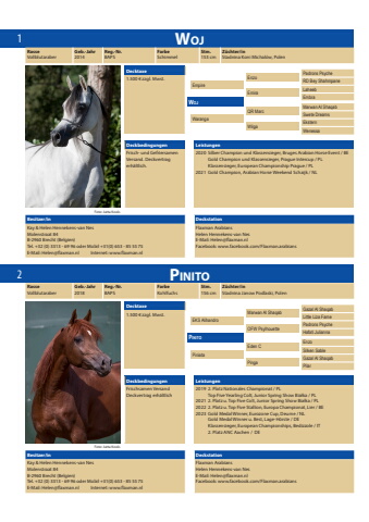 21 WojLeistungen2020 Silber Champion und Klassensieger, Bruges Arabian Horse Event / BEGold Champion und Klassensieger, Prague Intercup / PLKlassensieger, European Championship Prague / PL2021 Gold Champion, Arabian Horse Weekend Schaijk / NLRasseVollblutaraberGeb.-Jahr2014Reg.-Nr.BAPSFarbe SchimmelStm. 153 cmZ%u00fcchter/in Stadnina Koni Michal%u00f3w, PolenBesitzer/in DeckstationKay & Helen Hennekens-van NesMolenstraat 84B-2960 Brecht (Belgien)Tel. +32 (0) 3313 - 69 96 oder Mobil +31(0) 653 - 85 55 75E-Mail: Helen@flaxman.nl Internet: www.flaxman.nlFlaxman ArabiansHelen Hennekens-van NesE-Mail: Helen@flaxman.nlFacebook: www.facebook.com/Flaxman.arabiansEnzoEmiraQR MarcWilgaPadrons PsycheRD Bey ShahmpaneLaheebEmbraMarwan Al ShaqabSwete DreamsEksternWenessaEmpireWarangaWojDeckbedingungenFrisch- und Gefriersamen Versand. Deckvertrag erh%u00e4ltlich.Decktaxe1.500 %u20ac zzgl. Mwst.Foto: Jutta KoolsPinitoLeistungen2019 2. Platz Nationales Championat / PLTop Five Yearling Colt, Junior Spring Show Bia%u0142ka / PL2021 2. Platz u. Top Five Colt, Junior Spring Show Bia%u0142ka / PL 2022 2. Platz u. Top Five Stallion, Europa Championat, Lier / BE2023 Gold Medal Winner, Eurozone Cup, Deurne / NLGold Medal Winner u. Best, Lage-H%u00f6rste / DEKlassensieger, European Championships, Bedizzole / IT2. Platz ANC Aachen / DE RasseVollblutaraberGeb.-Jahr2018Reg.-Nr.BAPSFarbe KohlfuchsStm.156 cmZ%u00fcchter/in Stadnina Janow Podlaski, PolenBesitzer/in DeckstationKay & Helen Hennekens-van NesMolenstraat 84B-2960 Brecht (Belgien)Tel. +32 (0) 3313 - 69 96 oder Mobil +31(0) 653 - 85 55 75E-Mail: Helen@flaxman.nl Internet: www.flaxman.nlFlaxman ArabiansHelen Hennekens-van NesE-Mail: Helen@flaxman.nlFacebook: www.facebook.com/Flaxman.arabiansMarwan Al ShaqabOFW PsylhouetteEden CPingaGazal Al ShaqabLittle Liza FamePadrons PsycheHafati JuliannaEnzoSilken SableGazal Al ShaqabPilarEKS AlihandroPiniataPinitoDeckbedingungenFrischsamen Versand Deckvertrag erh%u00e4ltlichDecktaxe1.500 %u20ac zzgl. Mwst.Foto: Jutta Kools