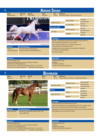 89Arian ShahLeistungenPr%u00e4mien- und Siegerhengst VZAP 2012. Elitehengst beim VZAP e.V.. Gek%u00f6rt Trakehnerverband 2024. HLP H%u00fcnfeld. Best in Show Best%u00e4ndeschau, 2019 Klassensieger und nationaler Reserve-Champion Aachen. 2 gek%u00f6rte S%u00f6hne (Camar Qbinec ox) und Bahrain (Trakehner), div. Pr%u00e4mien- und Siegerfohlen. Ausnahmevererber !RasseVollblutaraberGeb.-Jahr2007Reg.-Nr.DE-AV 3660Farbe SchimmelStm. 162 cmZ%u00fcchter/inLa Movida Arabians, F.Huemer, %u00d6sterreichBesitzer/in DeckstationCamelot Arabians GbRCorinna Knaack-Lindemann und Isa Lindemann-TreptauSeefeld 41, D-23843 Bad OldesloeTel. +49 (0) 45 31 - 89 69 09 4 oder Mobil +49 (0) 179 - 53 41 83 9Internet: www.camelot-arabians.de Facebook: CamelotArabiansCamelot Arabians GbRSeefeld 41D-23843 Bad OldesloeInternet: www.camelot-arabians.deFoto: Melanie GrogerDecktaxe Deckbedingungen900 %u20ac AV750 %u20ac andere RassenArian Shah deckt im Natursprung. Z%u00fcchterfreundliches Decktaxensplitting.Ludjin El JamaalNV Justa DreamCWP Chances AreAlisheebaAli JamaalLydira El ShaklanBey ShahMi Favorite ToiBey ShahBrandie AlexandraAli JamaalMohntikaJonathan El LudjinL.M. AlishaArian Shah (EH)BahrainLeistungenPublikumsliebling der Trakehnerk%u00f6rung 2023. Nobel, edel, charakerstark und ganggewaltig. HLP 50 TT in 2025 in Stadl Paura mit 7,77 absolviert. Top Noten f%u00fcr Interieur und Rittigkeit. %u00dcberzeugender erster Fohlenjahrgang mit fast ausschl. Championatsfohlen, alle langbeinig, edel mit Gang und Schick.RasseTrakehnerGeb.-Jahr2021Reg.-Nr.DE Farbe FuchsStm. 167 cmZ%u00fcchter/in Corinna Knaack-Lindemann, D-23843 Bad OldesloeBesitzer/in DeckstationCamelot Arabians GbRCorinna Knaack-Lindemann und Isa Lindemann-TreptauSeefeld 41, D-23843 Bad OldesloeTel. +49 (0) 45 31 - 89 69 09 4 oder Mobil +49 (0) 179 - 53 41 83 9Internet: www.camelot-arabians.de Facebook: CamelotArabiansCamelot Arabians GbRSeefeld 41D-23843 Bad OldesloeInternet: www.camelot-arabians.deJonathan El LudjinL.M. AlishaConneryBalaika IIILudjin El JamaalNV Justa DreamCWP Chances AreAlisheebaBuddenbrockCaro-Dame IIPreussenprinzBondinaArian Shah ox (EH)Barani Trak. (PrS)BahrainDecktaxe Deckbedingungen900 %u20ac zzgl. MwSt. Frischsamen in 2026 %u00fcber Station Maas J Hell (www.stallhell.de)Foto: C. Knaack-Lindemann